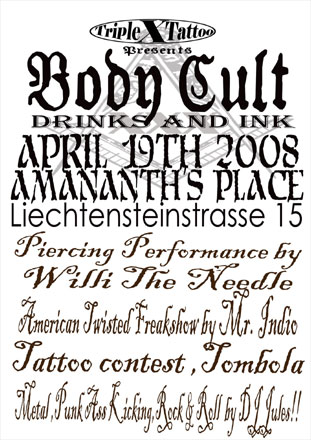 ![]() BODY CULT PARTY Drinks & Ink Piercing Performance by Willi the Needle, American Twisted Freakshow by Mr. Indio, Tattoo Contest, Tombola 19.04.2008, Amananth's Place, Liechtensteinstr. 15, Wien |