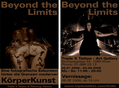 ![]() BEYOND THE LIMITS Eine fotografische Exkursion hinter die Grenzen moderner KörperKunst. Triple X Tattoo - Art Gallery Stumpergasse 34, 1060 Wien 05.07.2008 - 04.09.2008 Vernissage: 05.07.2009, ab 19:00 Uhr |