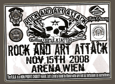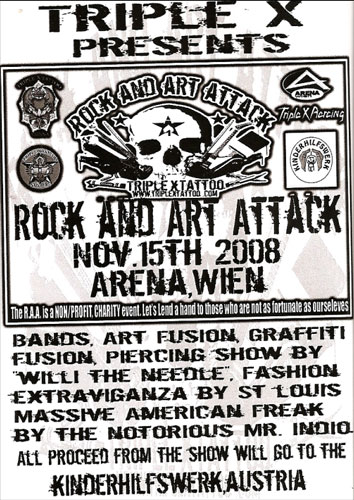 ![]() ROCK & ART ATTACK Bands, Art Fusion, Graffiti Fusion, Piercing Show by Willi the Needle, Fashion Extravaganza by St Louis, Freak Show by Mr. Indio All proceed from the show will go th the Kinderhilfswerk Austria 15.11.2008, Arena Wien |